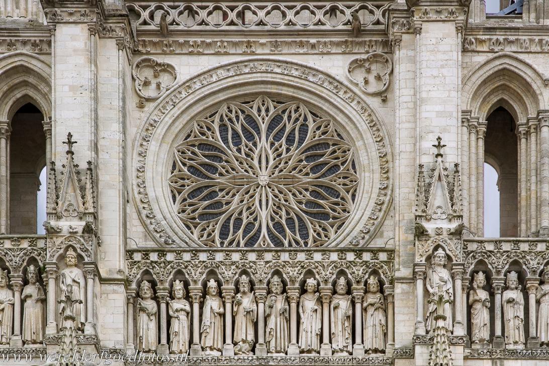 Kathedraal van Amiens: Het roosvenster in de west façade bevindt zich boven het centrale deel van de gebeeldhouwde Galerij der Koningen. Het immense roosvenster heeft een diameter van 13 meter. Het roosvenster werd in de 16de eeuw omgebouwd in de flamboyant-gotische stijl of de laat gotische stijl. In het midden van het roosvenster bevindt zich het wapen van de schenker van het raam, drie gebeeldhouwde hanen. Het venster bevindt zich boven het hoofdportaal van de kathedraal van Amiens.