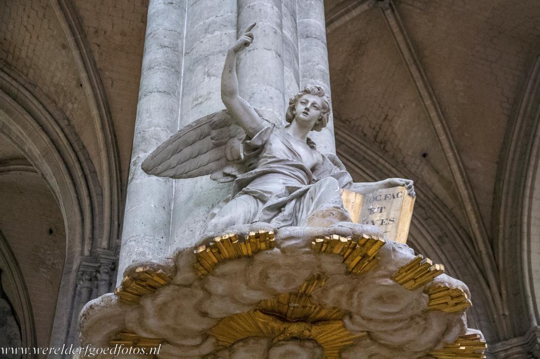 Kathedraal van Amiens: Een gebeeldhouwde engel op het klankbord van de imposante kansel. De kansel werd in de 18de eeuw vervaardigd van wit marmer en rijk gedecoreerd met vergulde houten accenten. De kansel wordt gedragen door drie vrouwenfiguren, ze symboliseren de drie theologische deugden: Geloof, Hoop en Liefde. De kathedraal van Amiens ligt in de historische regio Picardië, ongeveer 152 km ten noorden van Parijs. De kathedraal kreeg in 1981 de status Werelderfgoed van UNESCO.
