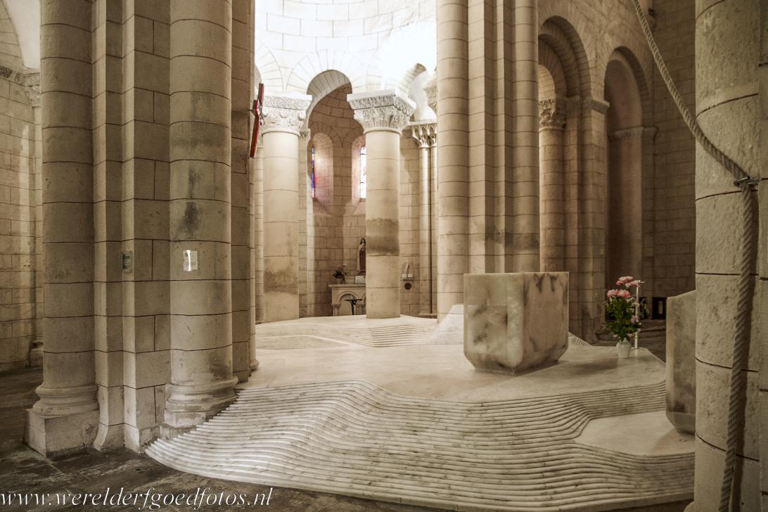 De kerk Saint Hilaire in Melle: Het gewelfde plafond boven het koor. De kerk is een meesterwerk van een wat afwijkende romaanse stijl, die veel rond de Franse stad Poitiers voorkomt. Behalve de Saint Hilaire staan in het dorpje Melle nog twee romaanse kerken, de Saint Savinien en Saint Pierre. Samen vormen ze de romaanse triade van Melle.