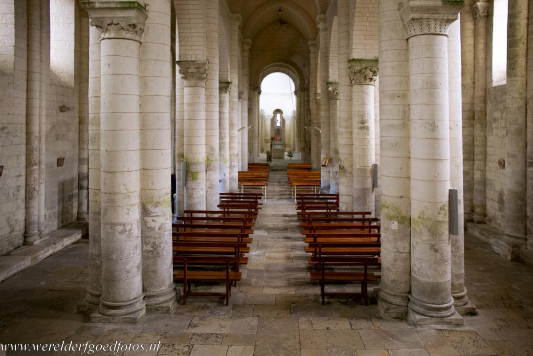 De kerk Saint Hilaire in Melle: Het imposante tongewelf van het schip. De Saint Hilaire werd aan het eind van de 11de en begin van 12de eeuw gebouwd. De kerk is een zogenaamde romaanse hallenkerk, maar het schip is echter veel breder dan de beide zijbeuken, wat vrij ongebruikelijk is bij hallenkerken. Het enorme dak wordt ondersteund door hoge zuilen.