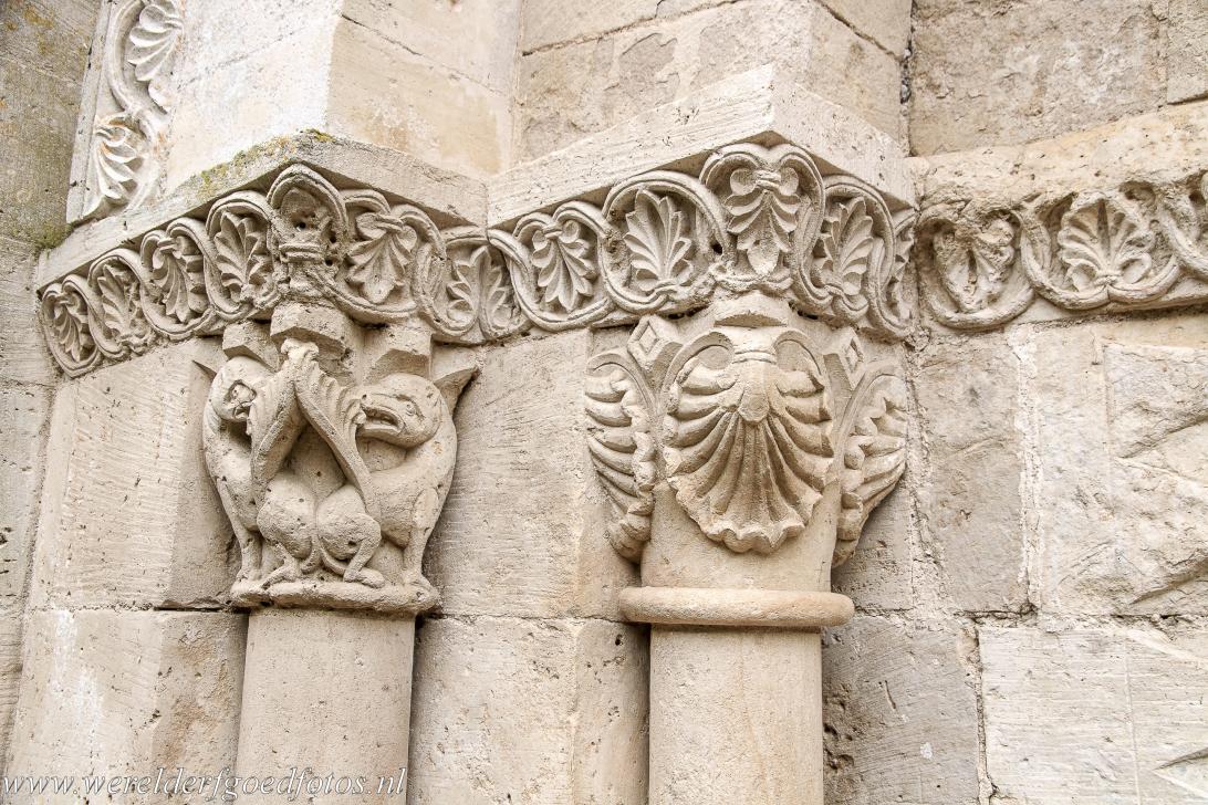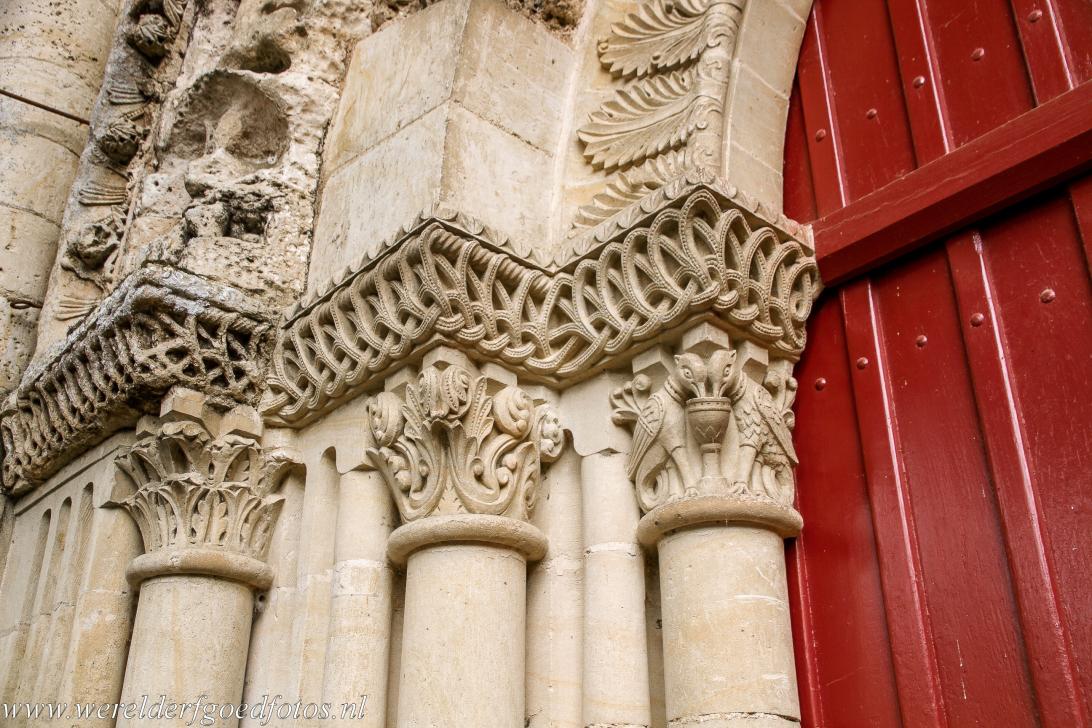 De romaanse kerk Saint Hilaire in Melle: Beeldhouwwerk op de deurposten van het noordelijke portaal. De kerk is verfraaid met een enorme hoeveelheid romaanse sculpturen, vooral aan de buitenmuren. De kerk Saint Hilaire werd tijdens de Honderd Jarige Oorlog (1337-1453) tussen Engeland en Frankrijk en tijdens de Franse Godsdienstoorlogen (1562-1598) grotendeels intact, hoewel het in de 19de eeuw een aanzienlijke restauratie onderging.