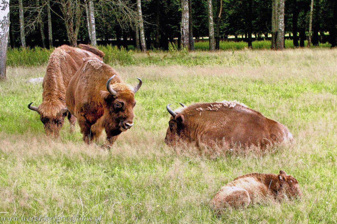 Enkele wisenten in het reservaat van Białowieża Nationaal Park. De wisent is het symbool van Białowieża Nationaal Park. De laatste wilde wisent in het oerbos van Białowieża werd gedood in 1919. In 1929 werden enkele wisenten uit een dierentuin gehaald en uitgezet. In Nationaal Park Bialowieza is een reservaat voor de wisent en dankzij hun fokprogramma om te voorkomen dat de wisent (Europese bizon) uitsterft, werd de wisent succesvol teruggebracht in de natuur.
