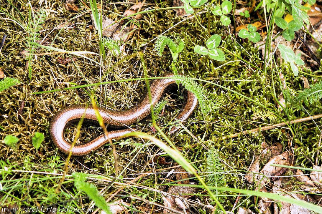 Belovezhskaya Pushcha / het oerbos van Białowieża: Een hazelworm ligt te zonnen naast een pad in het oerbos van Białowieża. Een hazelworm wordt vaak voor een slang aangezien, maar het is eigenlijk een pootloze hagedis. Hij komt voor in Europa en delen van Azië. De hazelworm is een van de zeven reptielensoorten, die in het bos van Białowieża voorkomen, ook leven er in de moerassen en waterstroompjes van het oerbos van Białowieża dertien soorten amfibieën.
