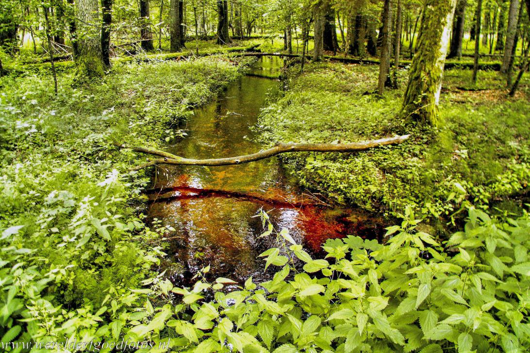 Een beek stroomt door het bos van Białowieża. Grote delen van het bos zijn moerassig. Bomen zijn bedekt met een laag mos, erop groeien paddenstoelen, die alleen in Białowieża voorkomen. In natte zomers staat overal water, waar de bomen met hun wortels in staan. In het oerbos van Białowieża groeien eeuwenoude bomen, zoals iepen, beuken, eiken, linden en naaldbomen, de bosbodem is bedekt met varens en andere planten, zoals bosanemonen en dotterbloemen.