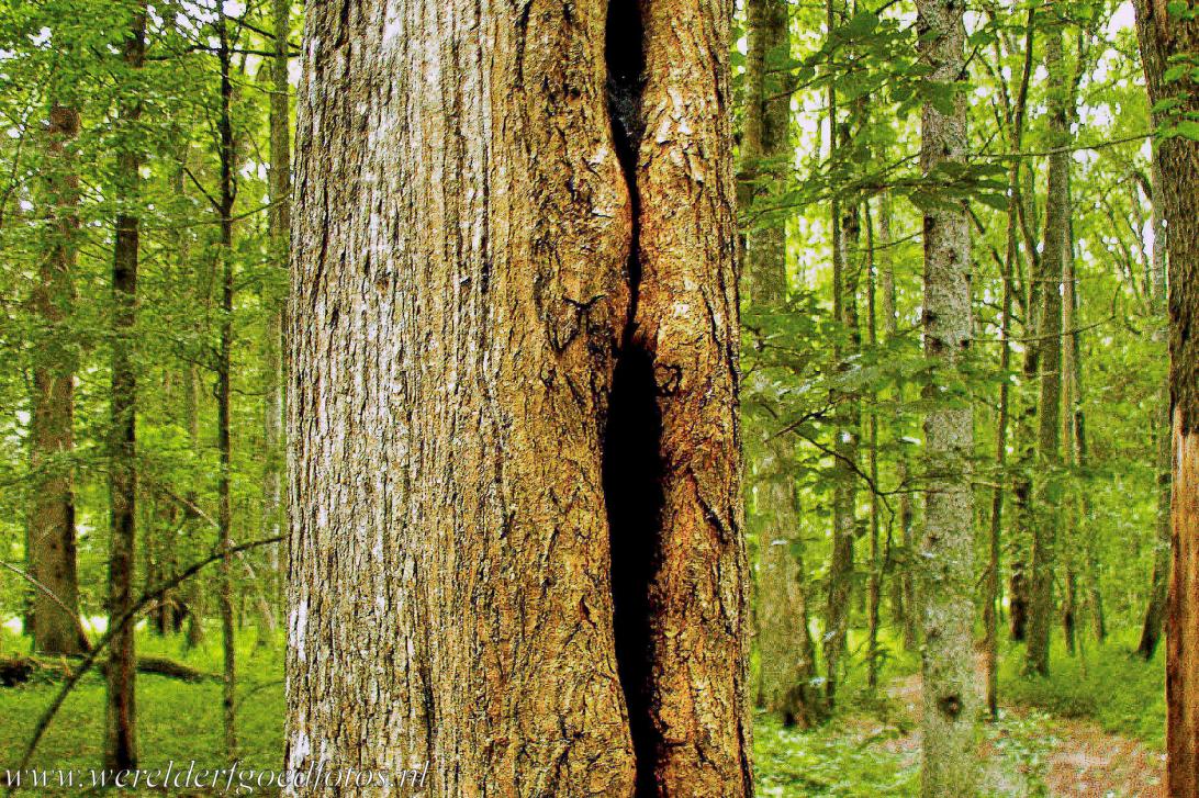 Het oerbos van Białowieża: Een door de vorst kapot gevroren boom. Een oerbos wordt niet of nauwelijks beïnvloed door menselijk ingrijpen, daarom zijn oerbossen vaak de leefomgeving van zeldzame of bedreigde diersoorten en planten. In het oerbos van Białowieża komen zoogdieren voor, zoals elanden, edelherten, wilde zwijnen, wolven en lynxen. In Białowieża zijn de bevers en wisenten opnieuw uitgezet.