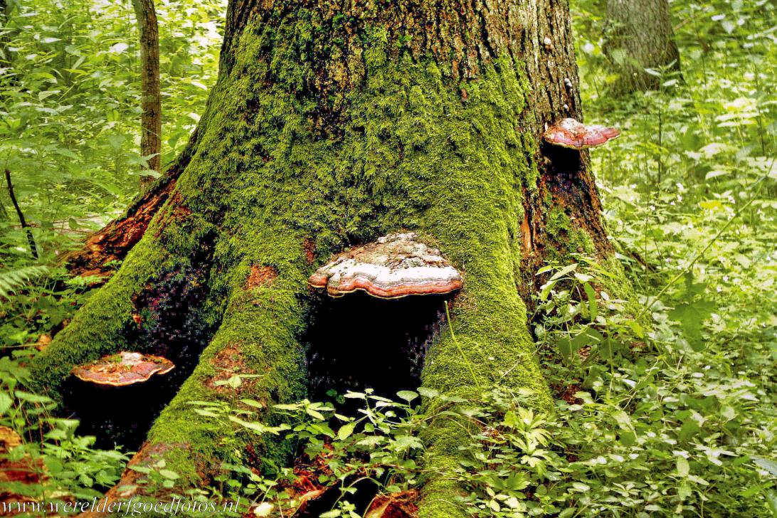 Het oerbos van Białowieża: Een met mos en roodgerande houtzwammen begroeide boom. Op de bosbodem en bomen groeien duizenden paddenstoelen, de roodgerande houtzwam is een van de zeldzamere paddenstoelensoorten, die in het bos van Białowieża voorkomen. In het bos van Białowieża komen circa 1200 plantensoorten voor, er groeien eeuwenoude bomen, zoals eiken en esdoorns. Enkele eiken kregen een naam, zoals de in 1974 omgewaaide Jagiełło eik.