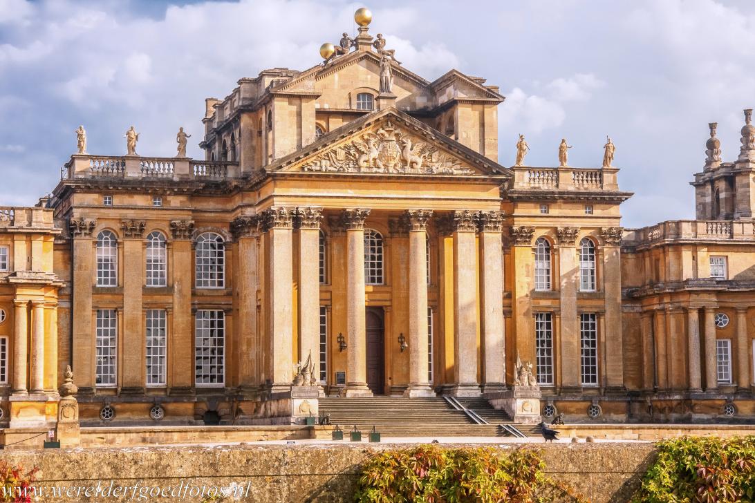 De voorgevel van Blenheim Palace met de hoofdentree aan de noordelijke binnenplaats of het hofplein, de Great Court. Blenheim Palace is het grootste landgoed in Groot-Brittannië en mag als enige niet-koninklijke landhuis in Engeland als paleis worden aangeduid, De ontwerp van het paleis werd sterk beïnvloed door de Palladiaanse architectuur. De Amerikaans-Engelse moeder van Winston Churchill beschreef Blenheim Palace als de 'Finest View in England'.