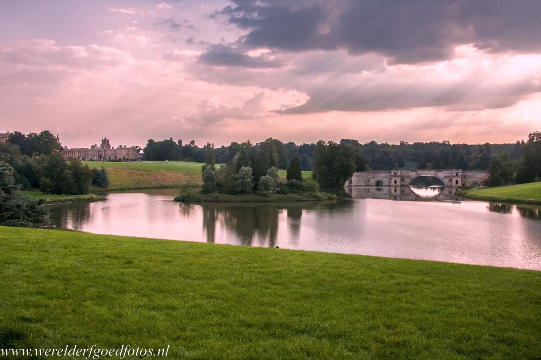 Avondlucht boven de Queen Pool en de Grand Bridge in het park van Blenheim Palace, de brug werd nooit helemaal voltooid. Het uitgestrekte landschapspark rond het paleis werd ontworpen door de in zijn tijd zeer beroemde Lancelot 'Capability' Brown, een landschaps- en tuinarchitect, die uitsluitend voor rijke en adelijke families tuinen en parken ontwierp, waarvan er ook nu nog meerdere bestaan, zoals Kew Gardens in London en de tuinen rond Warwick Castle.