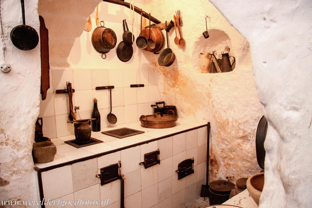 De Sassi di Matera en de grotkerken van Matera: Het keukentje in de grotwoning van Vittorio Solitario. Wegens de slechte hygiënische en sanitaire omstandigheden verbood de overheid in Italië in 1952 om in de Sassi te wonen, op dat moment had de Sassi di Matera 30.000 inwoners. De grotwoningen werden nog tot 1968 nog bewoond door ongeveer 15.000 mensen.
