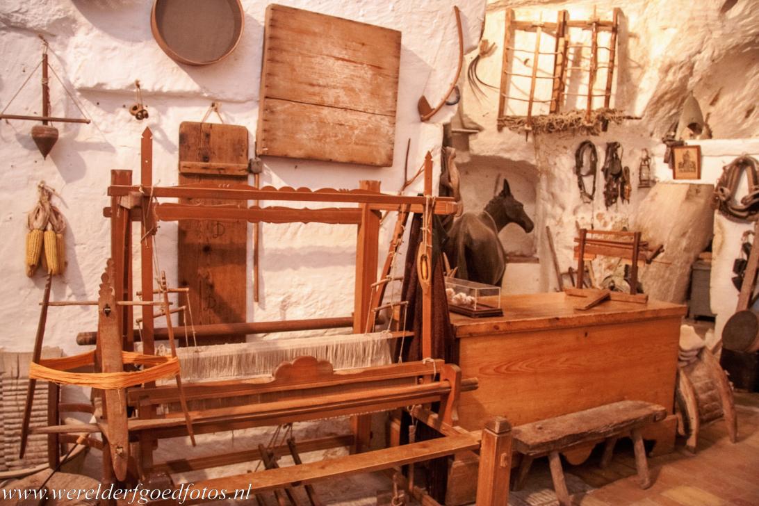 De Sassi di Matera en grotkerken van Matera: De kamer in een grotwoning. In een grotwoning bestond het meubilair hoofdzakelijk uit het ouderlijk bed. De Sassi van Matera behoort tot een van de best bewaard gebleven en de meest complete voorbeelden van een nederzetting met prehistorische grotwoningen in het Middellandse Zeegebied.