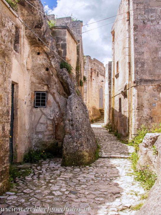 De Sassi di Matera en de grotkerken van Matera: Een smal straatje in de Sassi di Matera, achter de geveltjes liggen eenvoudige grotwoningen. In sommige delen van de Sassi liggen de straten bovenop de daken van de eronder liggende grotwoningen. Al in de prehistorie leefden in deze omgeving mensen in de grotten. De Sassi di Matera is nu een Werelderfgoed van UNESCO.