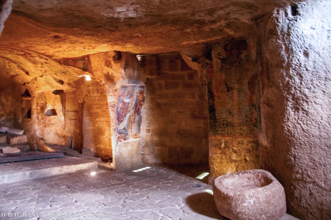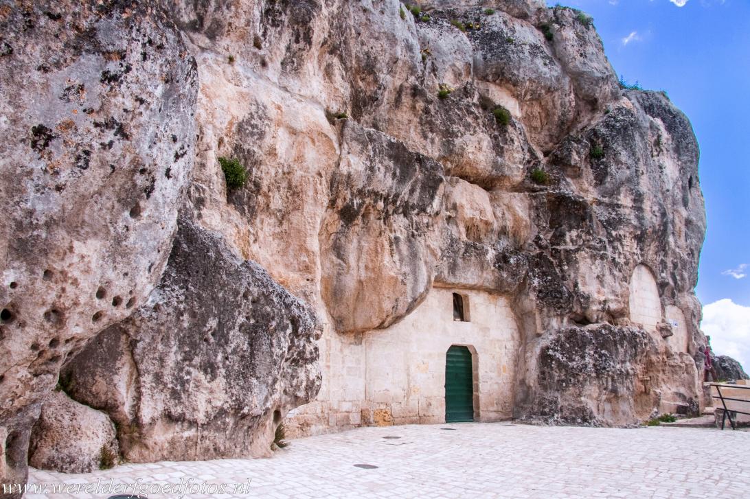 De Sassi di Matera en de grotkerken van Matera: De ingang naar de kerk van Madonna de Idris, ook Santa Maria di Idris genoemd. De kerk werd in 1230 uit de rots gehakt en bleef in gebruik tot ongeveer 1940. De meeste kerken van Matera werden uit de rotsen gehakt door monniken, die op de vlucht waren voor de christenvervolgingen in het Byzantijnse Rijk.