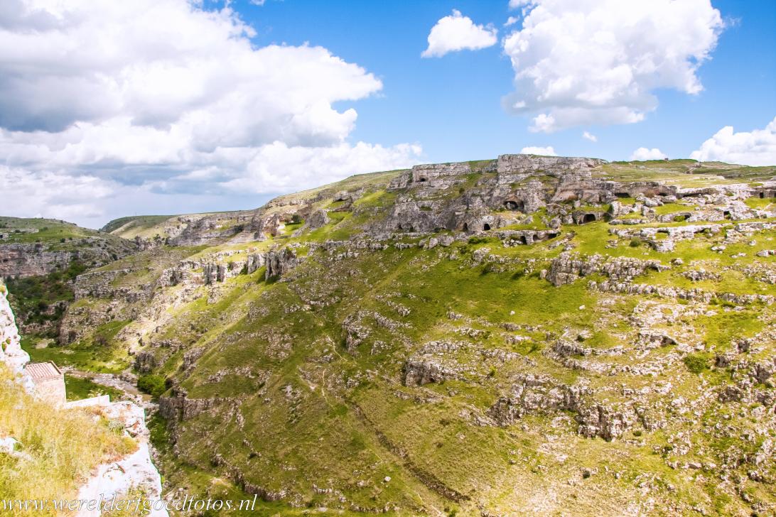 De Sassi di Matera en grotkerken van Matera: Vanuit de benedenstad met de grotwoningen kun je de bovenstad van Matera met de modernere woningen zien liggen. Het oudste complex met grotwoningen wordt de Sasso Caveoso genoemd, het jongere gebied is de Sasso Barisano. De grotwoningen liggen langs een ravijn, dat ontstond door de rivier de Gravina.