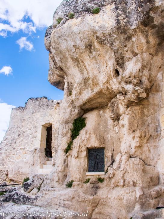De Sassi di Matera en de grotkerken van Matera: De ingang naar een van de grotkerken van de Sassi di Matera. Hoewel de Sassi di Matera een van de armste gebieden van Italë was, had het ruim honderdvijftig grotkerken, daarvan zijn er maar enkele te bezichtigen. Er zijn ook enkele grotwoningen geopend voor publiek.