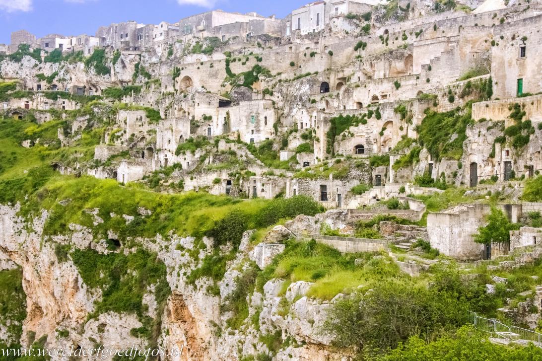 De Sassi di Matera en grotkerken van Matera: De grotwoningen van Matera liggen in een ruig landschap van rotsen en ravijnen, de Gravina van Matera. Eeuwenlang boden de grotten langs het ravijn een schuilplaats aan mensen. Al in de prehistorie leefden mensen in grotten, die uit de rotsen van de Gravina van Matera waren gehakt. De Sassi di Matera kent een geschiedenis van meer dan 9000 jaar onafgebroken bewoning. Wegens de slechte hygiënische en sanitaire omstandigheden werd het in 1952 door de overheid van Italië verboden in de Sassi te wonen. Op dat moment had de Sassi di Matera 30.000 inwoners. Tussen 1953 en 1968 woonden nog 15.000 mensen in de Sassi di Matera. In de Sassi bevinden zich veel grotkerken, sommige zijn maar enkele vierkante meters groot. De grotkerk van Madonna de Idris staat op het hoogste punt in de Sassi. Vijf grotkerken en een grotwoning zijn open voor bezichtiging. Vanuit de Sasso Caveoso, de benedenstad, kun je de bovenstad van Matera met de moderne woningen zien. De Sassi di Matera was de filmlocatie voor meerdere films, bij het zien van de Sassi di Matera had Mel Gibson zijn filmlocatie gevonden voor The Passion of the Christ. De Sassi di Matera liggen 65 km van het Werelderfgoed Castel del Monte en 68 km van de Trulli van Alberobello. De Sassi di Matera en de grotkerken van Matera kregen in 1993 de status Werelderfgoed van UNESCO. Het Werelderfgoed staat inheschreven op de Werelderfgoedlijst van UNESCO als: The Sassi and the Park of the Rupestrian Churches of Matera.