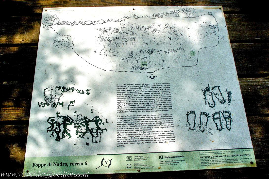 Rotstekeningen in Valcamonica: Informatie en uitleg over de rotstekeningen, op het bord staan petrogliefen (rotstekeningen) nagetekend met een uitleg erbij, de tekeningen op de rotsen zijn hierdoor makkelijker te herkennen, want de rotstekeningen in Valcamonica zijn niet ingekleurd met verf, zoals in andere landen, b.v. bij de rotstekeningen van Tanum in Zweden.