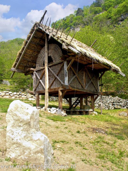 Rotstekeningen in Valcamonica: Een naar de tekeningen op de rotsen gereconstrueerde hut. De rotstekeningen in Valcamonica werden gemaakt door de Camunni. Of dit oude volk werkelijk in dit soort hutten leefden, is giswerk. Deze hutten staan in Foppe di Nadro. De rotstekeningen van Valcamonica werden in 1979 een Werelderfgoed van UNESCO.