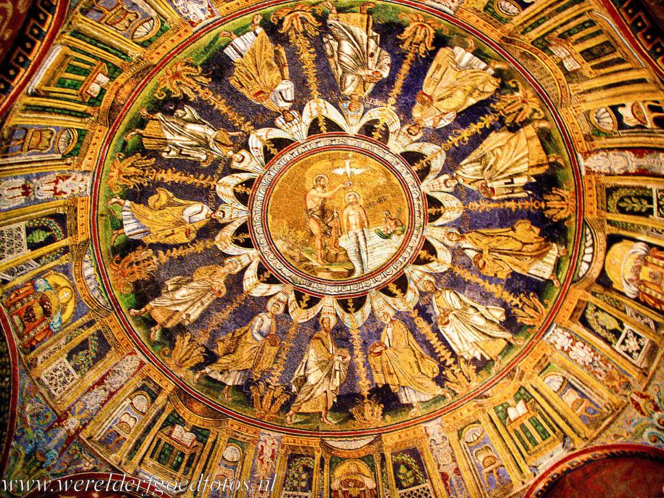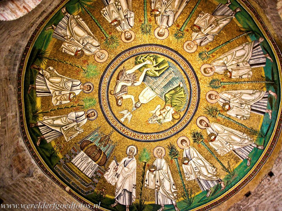 Vroeg-christelijke bouwwerken van Ravenna: Het Baptisterium van de Orthodoxen (Battistero Neoniano) met een 5de eeuws mozaïek op het interieur van de koepel. Het mozaïek toont de Doop van Christus door Johannes de Doper in de Jordaan, het is een van de oudste mozaïeken van de doop van Christus, die zich in een historisch gebouw bevinden. Het Baptisterium van de Orthodoxen is een Werelderfgoed van UNESCO.