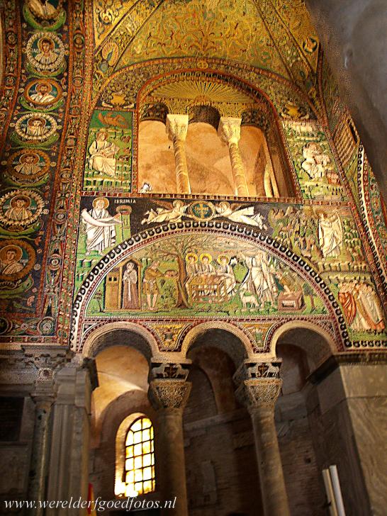 Vroeg-christelijke bouwwerken van Ravenna: De Basiliek van San Vitale schittert door de goud met groene mozaïeken. De Basiliek van San Vitale werd gebouwd in de periode 526-547. In de basiliek zijn de mooiste Byzantijnse mozaïeken van West-Europa te zien, ze dateren uit dezelfde tijd als de bouw van de San Vitale. De mozaïeken van de San Vitale worden als de mooiste uit de Byzantijnse tijd gezien, samen met de mozaïeken van de Eufrasius basiliek in Kroatië.