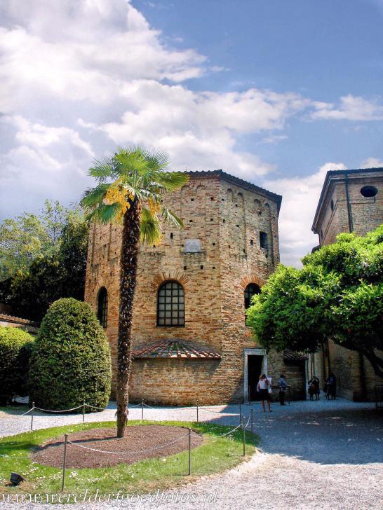 Vroeg-christelijke bouwwerken van Ravenna: Het Battistero degli Ariani, het baptisterium van de Arianen, werd in 500 AD gebouwd, en zoals veel doopkapellen uit die tijd, is het achthoekig van vorm. Het baptisterium heeft vier kleine apsissen. Van de mozaïeken, die de muren ooit hebben bedekt, is niets over, alleen de koepel bevat nog een mozaïek: De doop van Jezus in de Jordaan. Het baptisterium werd een katholieke kerk, toen Ravenna in 540 AD werd ingenomen door het Byzantijnse Rijk, dat het Arianisme in Italië beëindigde.