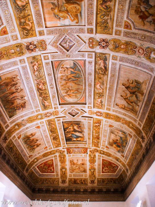 Ferrara, stad van de Renaissance en haar Po Delta: Het plafondfresco's in de speelzaal van het kasteel van Estense. Het plafond van de zaal is verdeeld in elf panelen, verfraaid met fresco's, die verschillende sportactiviteiten uitbeelden, want graaf Alfonso II had een grote passie voor sport. De zaal werd gebruikt voor concerten of spelen. Ferrara, stad van de Renaissance en de Po Delta werden in 1995 een Werelderfgoed van UNESCO.
