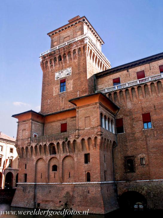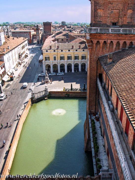 Ferrara, stad van de Renaissance en haar Po Delta: Ferrara gezien vanaf het kasteel van Estense. Het kasteel van Estense is omgeven door een slotgracht. Het kasteel heeft drie toegangspoorten met ophaalbruggen. Ferrara, stad van de Renaissance en haar Po Delta staan sinds 1995 op de Werelderfgoedlijst van UNESCO als: Ferrara, City of the Renaissance, and its Po Delta.