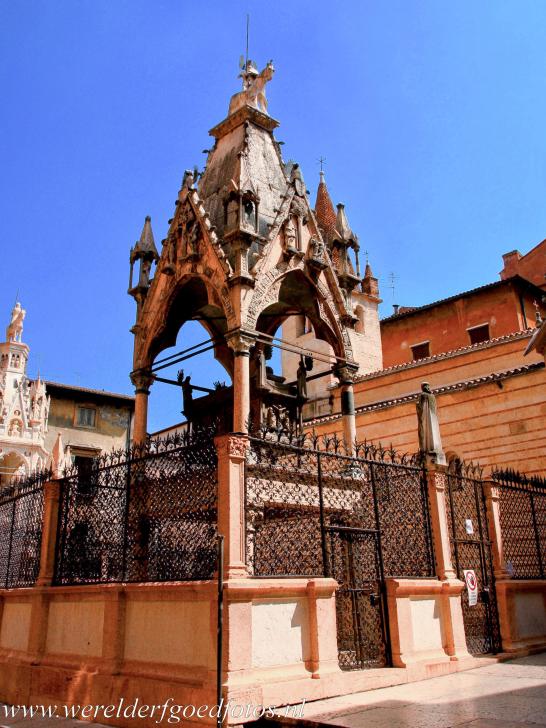 Verona: De Arche Scaligere en de monumentale graftombe van Mastino II, een van de leden van de familie Scaliger. De Arche Scaligere zijn de imposante graftombes van het geslacht Scaliger, de heren van de stad Verona. Rond de graftombes staan standbeelden van deze adelijke heren. Het beroemde geslacht Scaliger regeerde Verona van 1260 tot 1387 en nog tien dagen in 1404.