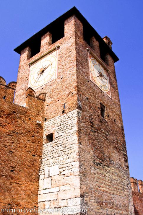 De stad Verona: De klokkentoren van kasteel Castelvecchio, in 19de eeuw werd de klok op de toren aangebracht. Castelvecchio staat op de oever van de rivier de Adige, het wordt omgeven door muren, versterkte torens en een slotgracht, die gevuld was met water uit de nabijgelegen rivier de Adige. Het kasteel is gebouwd van rode baksteen en is een middeleeuws meesterwerk.