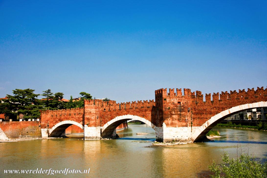 De stad Verona: De Ponte Scaligero over de rivier de Adige. In 1945 werd de stenen boogbrug volledig verwoest door het terugtrekkende Duitse leger. Na de Tweede Wereldoorlog werd de brug gereconstrueerd, de werkzaamheden begonnen in 1949 en werden voltooid in 1951. De stad Verona staat sinds 2000 ingeschrevenop de Werelderfgoedlijst van UNESCO.