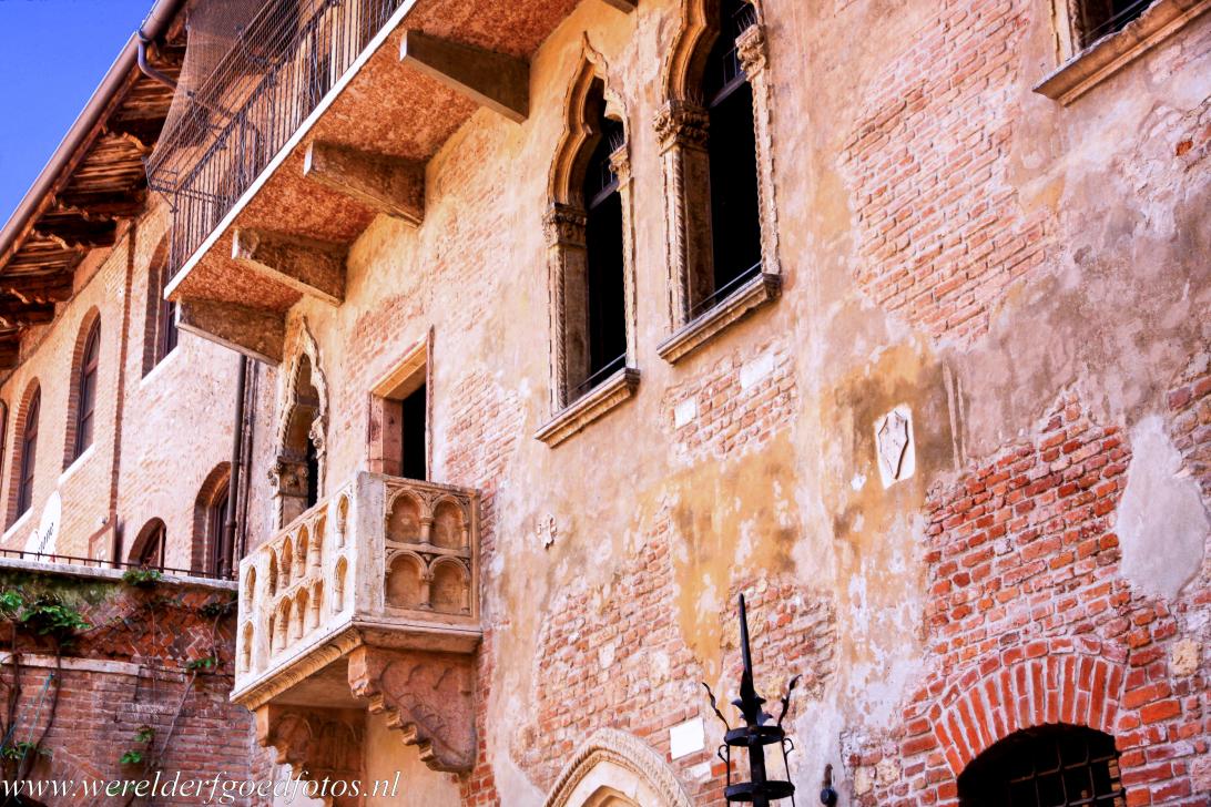 De stad Verona: Het Huis van Julia met het beroemde balkon. Verona is de stad van Romeo en Julia. Hoewel het fictieve personen waren, staan in Verona de vermeende huizen van Romeo en Julia. Het Huis van Julia dateertt uit de 12de eeuw, het balkon werd pas rond 1930 aan de gevel gebouwd. Het Huis van Romeo ligt niet ver van het Huis van Julia. In tegenstelling tot de enorme drukte bij het Huis van Julia, was het bij het Huis van Romeo rustig.