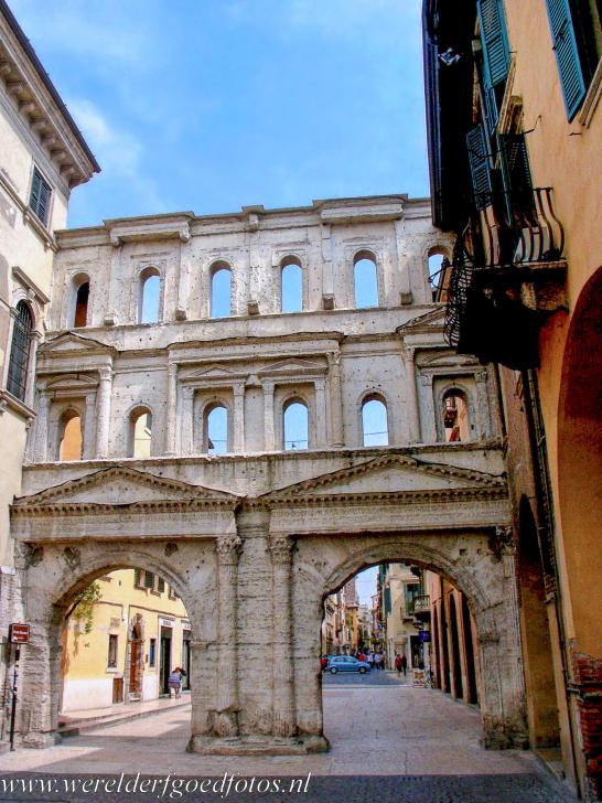 De stad Verona: De gevel van de Porta dei Borsari, een Romeinse stadspoort uit de 3de eeuw. Bij de Porta dei Borsari moesten rondtrekkende kooplieden belasting betalen voor ze Verona binnenkwamen of verlieten. Van de poort bestaat alleen nog de façade. De stad Verona kreeg in 2000 de status Werelderfgoed van UNESCO.